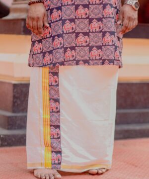 White Dhoti with Elephant & Mandala Border – Yellow Stripe Detail