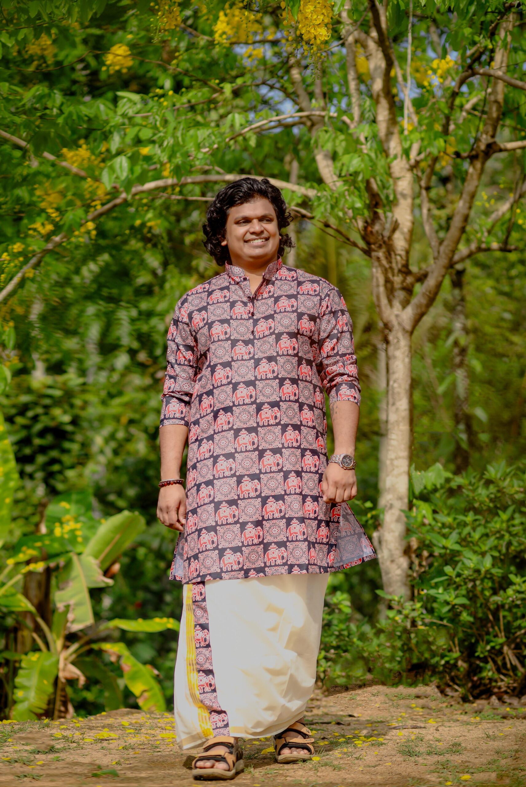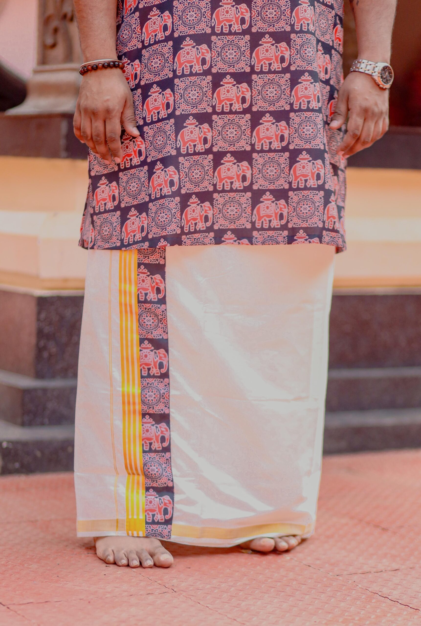 Rooted in traditional elegance, this white dhoti blends cultural motifs with modern style. Its standout feature is the intricately printed border—featuring alternating mandala patterns and red elephant motifs on a deep navy base. Complementing the border is a vibrant set of three yellow stripes, adding a festive rhythm to the flow of the fabric.